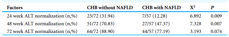 表3:CHB组和CHB-NAFLD组PEG IFNα治疗的生化应答