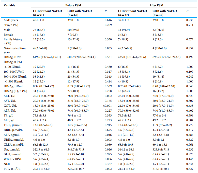共纳入158例患者,其中CHB组91例,CHB-NAFLD组67例。平均年龄为39.0 ± 8.0岁,85.4%为男性,38.6%为HBeAg阳性。CHB-NAFLD组的ALT、GGT、WBC及PLT水平显著高于CHB组(P < 0.05)。经PSM后,两组的基线特征无显著差异。