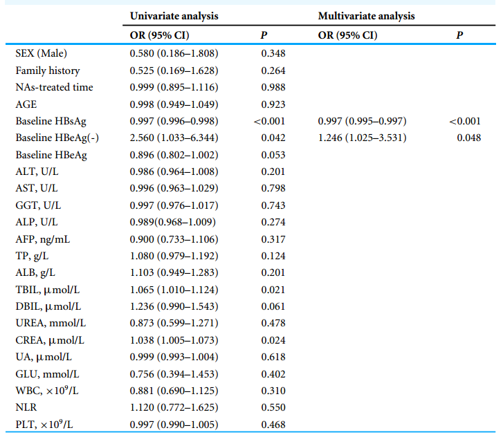 表2:逻辑回归分析HBsAg清除的预测因素