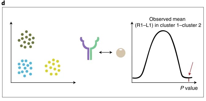 在构建零分布之后,依据原始细胞分群计算同一配体-受体对在相应两种细胞类型之间的实际平均表达乘积。根据在零分布中该值等于或高于实际平均表达乘积的比例,推算该配体-受体对在这两种细胞类型之间相互作用的显著性 P 值(图 d)。