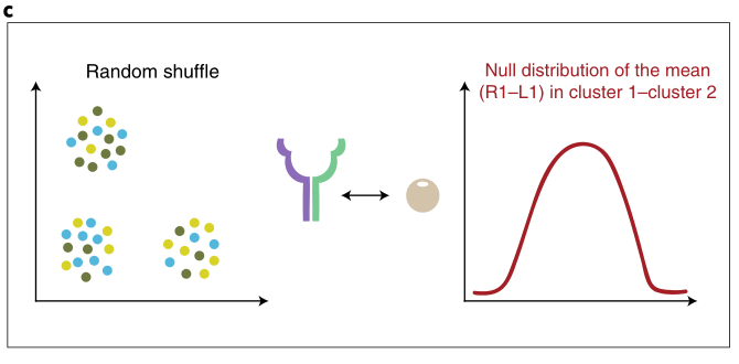 随后,算法在数据集中所有细胞类型之间进行两两比较。具体而言,首先对细胞类型标签进行随机置换,将所有细胞随机分配到新的细胞群中(默认随机置换 1000 次),并计算在新群体条件下,配体在发送细胞类型中的平均表达水平与受体在接收细胞类型中的平均表达水平的乘积。通过这种方式,为每一对细胞类型之间的每一个配体-受体对生成一个零分布(图 c)。