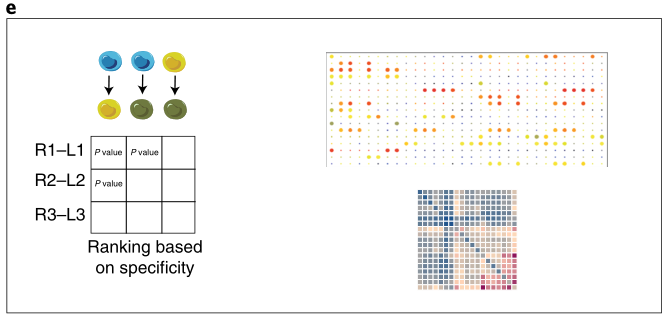 在此基础上,根据每对细胞类型之间所富集的显著配体-受体对的数量,对细胞类型间高度特异的相互作用进行排序,以便进一步人工筛选具有生物学意义的相关相互作用。通过上述流程,基于特异性的蛋白质复合物信息,可预测细胞群体之间可能的分子相互作用,从而构建出细胞群体间的潜在通讯网络,并最终以表格和图形等直观形式进行可视化展示(图 e)。