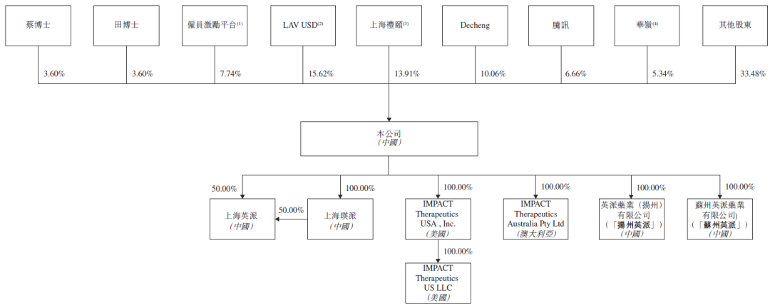 英派药业最新股权结构如下,礼来亚洲连投六轮,LAV USD持股15.62%,礼颐投资持股13.91%,德诚资本持股10.06%,腾讯持股6.6%,华领持股5.34%。