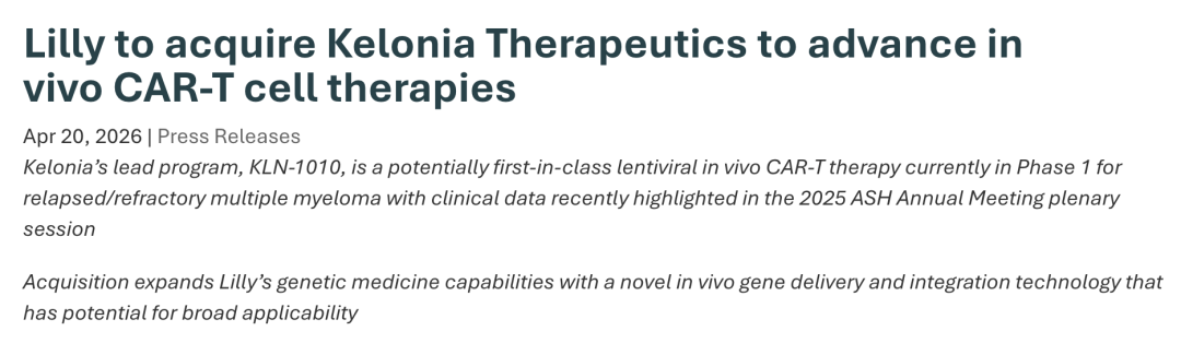 2026 年 4 月 20 日,国际制药巨头礼来公司(Eli Lilly)与 in vivo CAR-T 细胞疗法开发公司 Kelonia Therapeutics 宣布达成最终协议,礼来公司将收购 Kelonia。