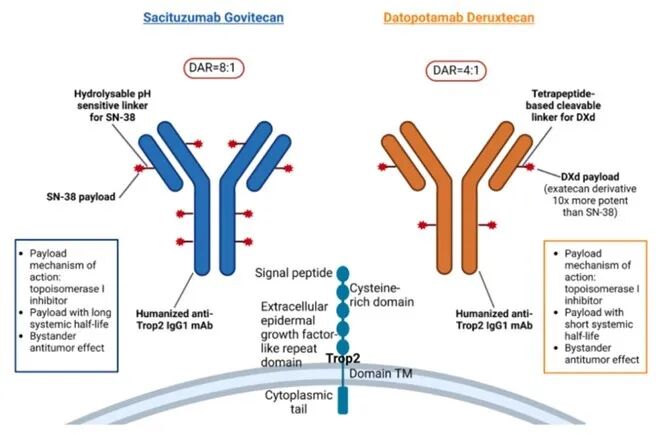 吉利德就是一个最典型的焦虑缩影。作为MNC巨头,吉利德手里握着重磅靶向Trop-2的ADC药物Trodelvy,但由于使用的是较早一代的连接子和毒素(SN-38),导致其在血液循环中容易释放payload,且在与阿斯利康/第一三共的同靶点ADC正面交锋中,屡屡面临疗效和安全性的双重压力。