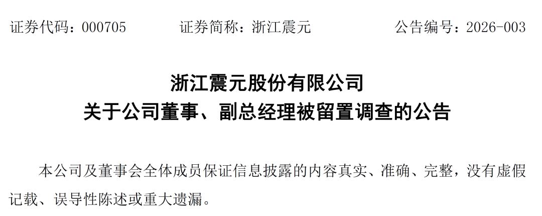 4 月 18 日,浙江震元股份有限公司于深交所发布《关于公司董事、副总经理被留置调查的公告》,披露公司于 2026 年 4 月 16 日收到监察机关《留置通知书》和《立案通知书》,公司董事、副总经理魏民被立案调查并实施留置措施。