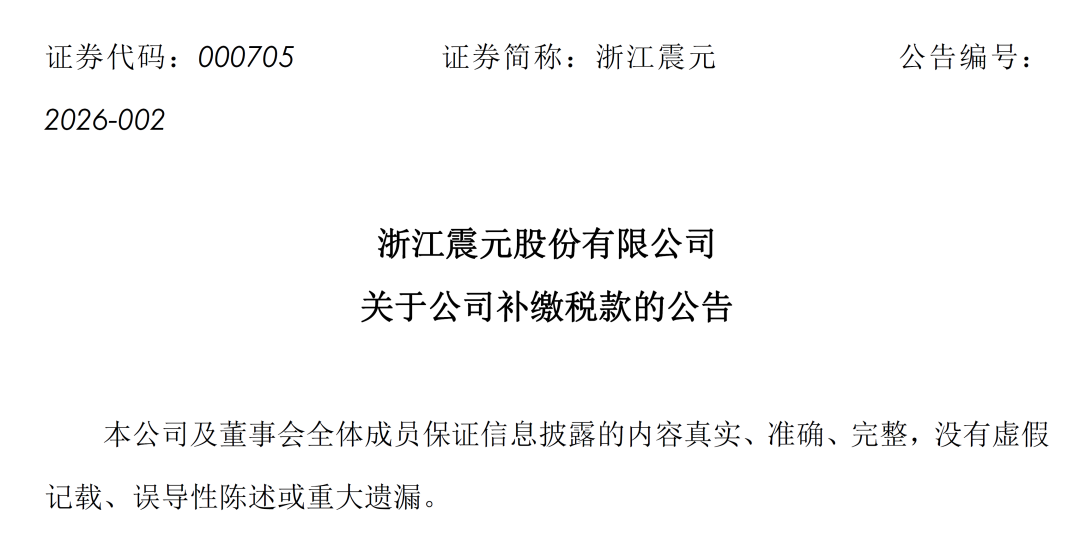 浙江震元表示,根据相关规定,上述补缴税款及滞纳金事项不属于前期会计差错,不涉及前期财务数据追溯调整。上述税款和滞纳金将计入 2026 年当期损益,对公司 2026 年度归属于上市公司股东的净利润的具体影响,最终以 2026 年度经审计的财务报表为准。