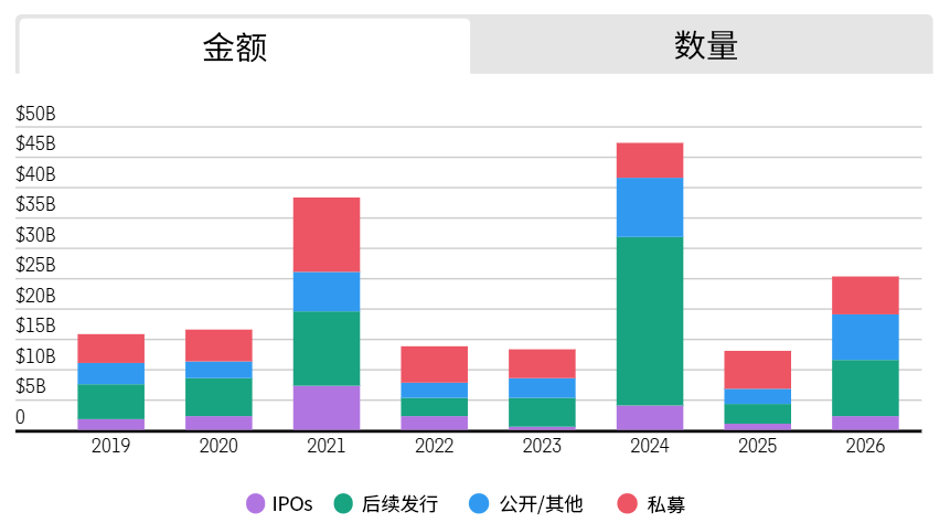 2026 年 Q1,生物制药领域的 IPO 活动总额为 22 亿美元,是 2025 年同期 10.5 亿美元的两倍,但低于 2024 年的 39.9 亿美元。该金额是 2023 年初记录的 6.18 亿美元的三倍以上。2026 年的总额与经济衰退前的水平大致相当,可与 2020 年的 21.8 亿美元和 2022 年的 23.2 亿美元相媲美,但仍低于 2021 年 71.4 亿美元的峰值。