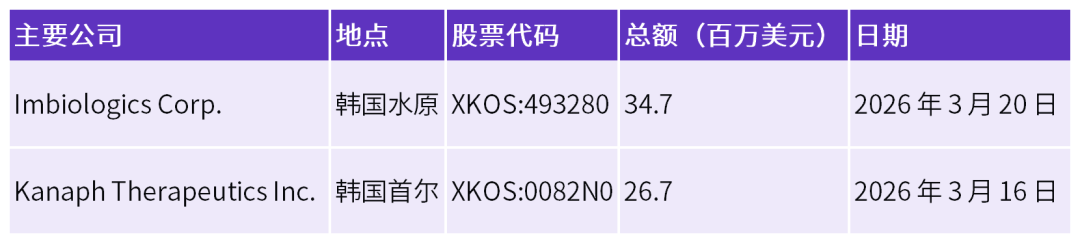 3 月份最大的 IPO 来自 Imbiologics Corp.,该公司于 3 月 20 日在科斯达克 (Kosdaq) 首次亮相后,市值达到 1.5 万亿韩元(10.2 亿美元)。其股票 (KOSDAQ:493280) 开盘时飙升 300%,收于 104,000 韩元,较公司约 2.5788 亿美元的初始估值大幅上涨。此次发行募集了 3,470 万美元,成为今年迄今为止韩国最大的生物技术 IPO。总部位于韩国水原的 Imbiologics 计划将募资所得用于推进其用于自身免疫和免疫肿瘤学适应症的抗体管线研发,扩展其平台并加强研发能力,包括开发其主要资产 IMB-101 (Oxtima)。