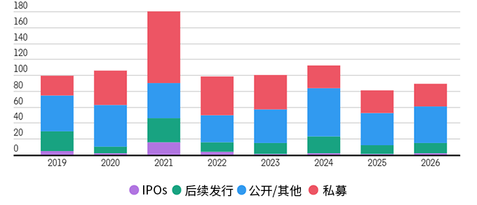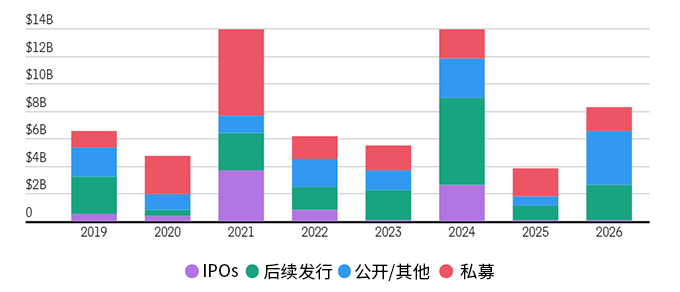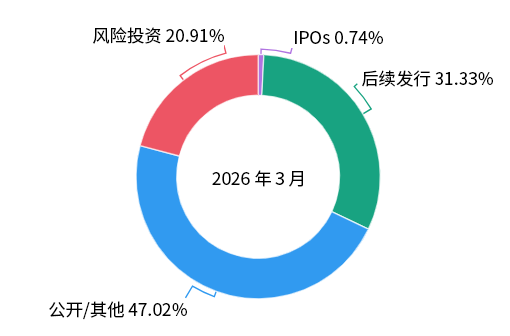 3 月份共记录了 46 宗公开/其他融资(上市公司的私募融资),总额达 38.9 亿美元,高于 2 月份的 25 宗11.8 亿美元和 1 月份的 23.9 亿美元。