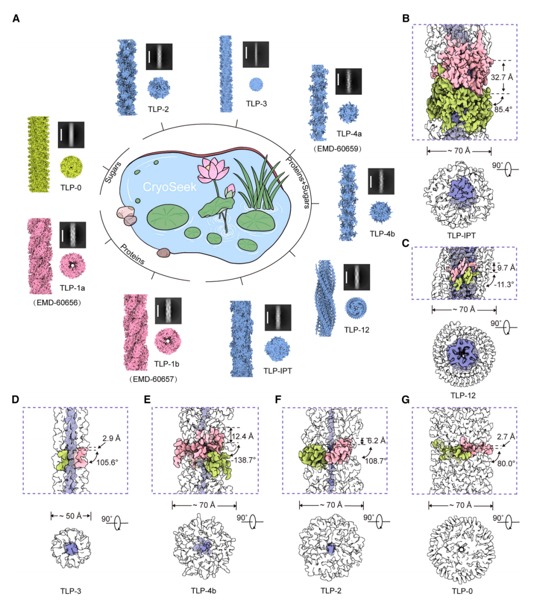 利用 CryoSeek 策略,研究团队对清华荷塘(Tsinghua Lotus Pond,简称 TLP)的滤过水样进行观察分析,发现了丰富多样的生物大分子,其中长短、粗细不一的纤维状结构在占据主导地位。例如,其中两种螺旋糖蛋白纤维——TLP-1a 和 TLP-1b,直径约为 8 nm,具有独特的形状和厚度,来自未知物种,研究团队认为,其很可能是某种细菌用于物质递送和辅助运动的菌毛。