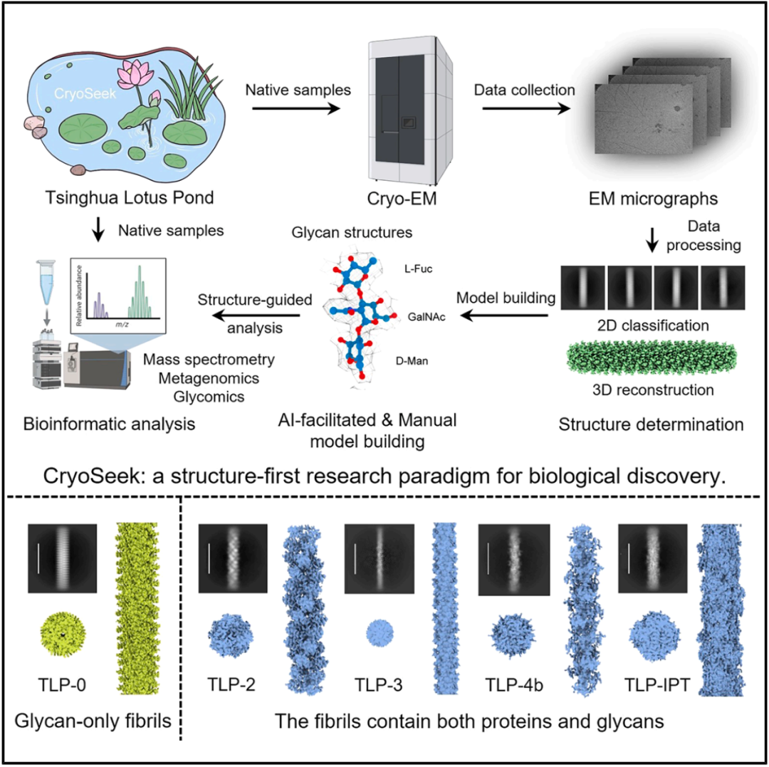在这项发表于 Cell Chemical Biology 的新研究中,研究团队利用 CryoSeek 策略,从清华荷塘(TLP)水样中发现的 5 种新型糖纤维——TLP-0、TLP-2、TLP-3、TLP-4b、TLP-IPT,并解析了其高分辨率结构(分辨率在 3.0-3.5 Å 之间),足以看清原子级细节,所有这些纤维都被密集的糖壳(glycoshell) 所包裹,但其核心蛋白成分的占比和形态却千差万别,展现了从完全由蛋白质构成到完全由糖类构成的连续性结构多样性,进而揭示了糖类在生物大分子组装中前所未有的核心作用。