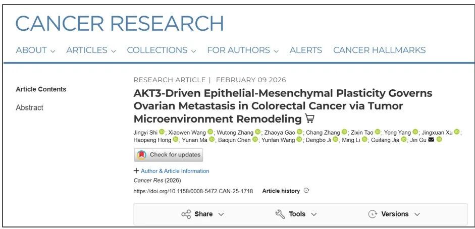 2026年2月,北京大学首钢医院顾晋教授团队联合北京大学化学与分子工程学院贾桂芳教授团队于《Cancer Research》发表了“AKT3-Driven Epithelial-Mesenchymal Plasticity Governs Ovarian Metastasis in Colorectal Cancer via Tumor Microenvironment Remodeling”,该研究通过单细胞RNA测序与批量转录组图谱的整合分析,首次精准解析结直肠癌卵巢转移(CROM)的核心机制,明确AKT3驱动的上皮—间质可塑性(EMT可塑性)与癌症相关成纤维细胞(CAFs)激活形成的正反馈环路,是启动卵巢转移的关键驱动力,同时证实结直肠癌卵巢转移患者来源类器官(CROM-PDOs)可作为精准治疗研发的可靠平台,为这一难治性转移亚型提供了全新治疗靶点与研究方向。