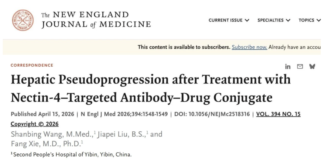 2026 年 4 月 16 日,国际顶尖医学期刊《新英格兰医学杂志》(NEJM)刊登了一篇来自宜宾市第二人民医院汪善兵团队题为:Hepatic Pseudoprogression after Treatment with Nectin-4–Targeted Antibody–Drug Conjugate 的通讯文章,报道了一位 49 岁宫颈癌患者在接受了新型抗癌药抗体药物偶联物(ADC)治疗后,肝脏出现了一个看似肿瘤进展的病灶,但最终被证实是药物起效的特殊表现。