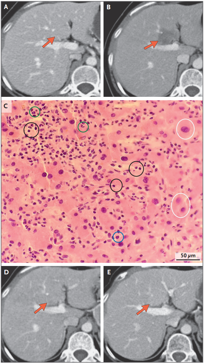 该患者试验入组前影像学检查未见肝脏肿瘤。在治疗过程中,CT 发现肝脏病变,但肿瘤标记物明显下降,最终活检证实该病例为假性进展。这个案例不仅罕见,更对癌症治疗中的影像学评估提出了重要警示——影像学上的“进展”不一定代表治疗失败,有时恰恰是免疫系统被激活、治疗起效的信号,因此,面对复杂的治疗反应时,需要综合影像学、生物标志物和病理学证据,做出最有利于患者的决策。