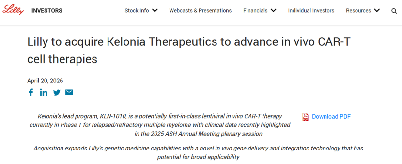 近日,礼来再次震惊了医药界。在距上一次出手仅两个月后,这家凭减重药替尔泊肽赚得盆满钵满的制药巨头,将以32.5亿美元首付款、最高70亿美元的“天价”,将体内CAR-T公司Kelonia Therapeutics收入囊中,同时刷新该领域的最高收购记录。加上今年2月以最高24亿美元收购的Orna Therapeutics,礼来仅在体内CAR-T这一条赛道上就已砸下近百亿美元。