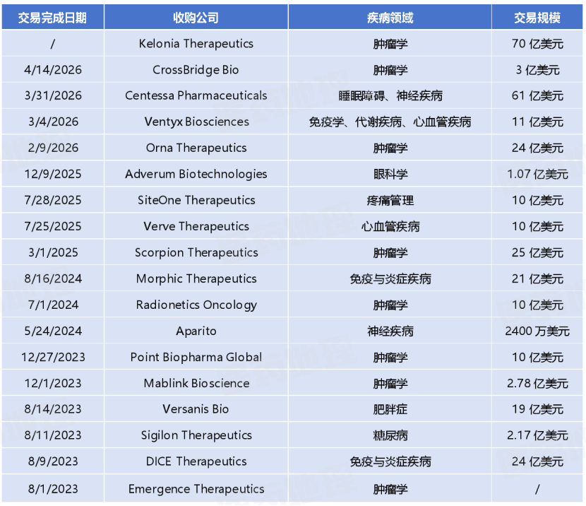 吉利德旗下Kite以3.5亿美元买下Interius BioTherapeutics,并与Pregene签署了价值高达16亿美元的合作协议。艾伯维21亿美元收购了专注自身免疫疾病的Capstan Therapeutics。BMS 15亿美元收入Orbital Therapeutics。强生则选择了另一条路径——去年11月与Kelonia达成合作,而非直接收购。