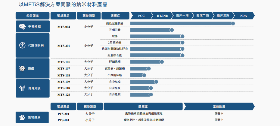 其他核心资产,包含MTS-105、MTS-109、MTS-201、PTS-101及PTS-201等处于不同开发阶段的管线,覆盖肿瘤、免疫、中枢神经系统等疾病领域。