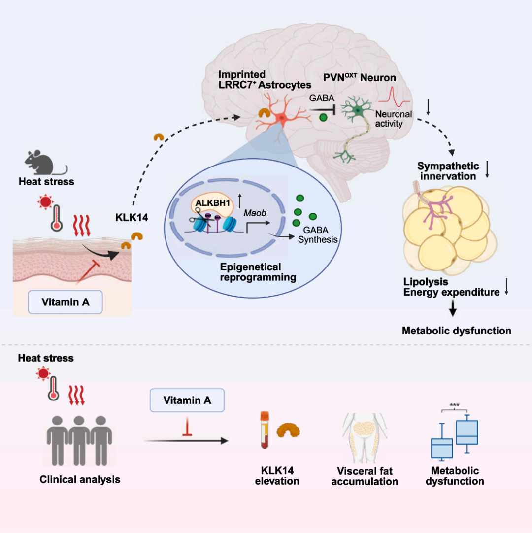 这项研究首次揭示了一个惊人机制——热应激会通过 KLK14 依赖的表观遗传重编程,在下丘脑的特定细胞中留下持久的“热记忆”,从而让你在后续面对高脂饮食时,更容易发生代谢紊乱和内脏脂肪堆积,而维生素 A 则通过抑制 KLK14 的产生来阻断这一过程,改善热应激诱导的小鼠和人类的代谢紊乱。