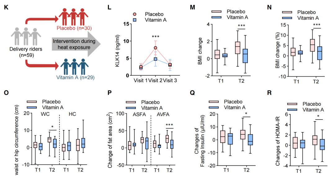 为探究维生素 A 是否能减轻热记忆加速的人体代谢功能障碍,研究团队招募了 68 名健康外卖骑手,他们被被随机分配接受安慰剂或维生素 A(每天补充 5000 国际单位的维生素 A),共有 59 名外卖骑手完成了研究(维生素 A 组 29 人;安慰剂组 30 人),且两组的总工作时间和高温暴露强度相当。结果显示,维生素 A 使高温暴露后的 KLK14 上升幅度降低,相比安慰剂组,维生素 A 组的体重增加更低,维生素 A 组的腰围、腹部脂肪面积、空腹胰岛素和胰岛素抵抗指数的增加幅度也更小。