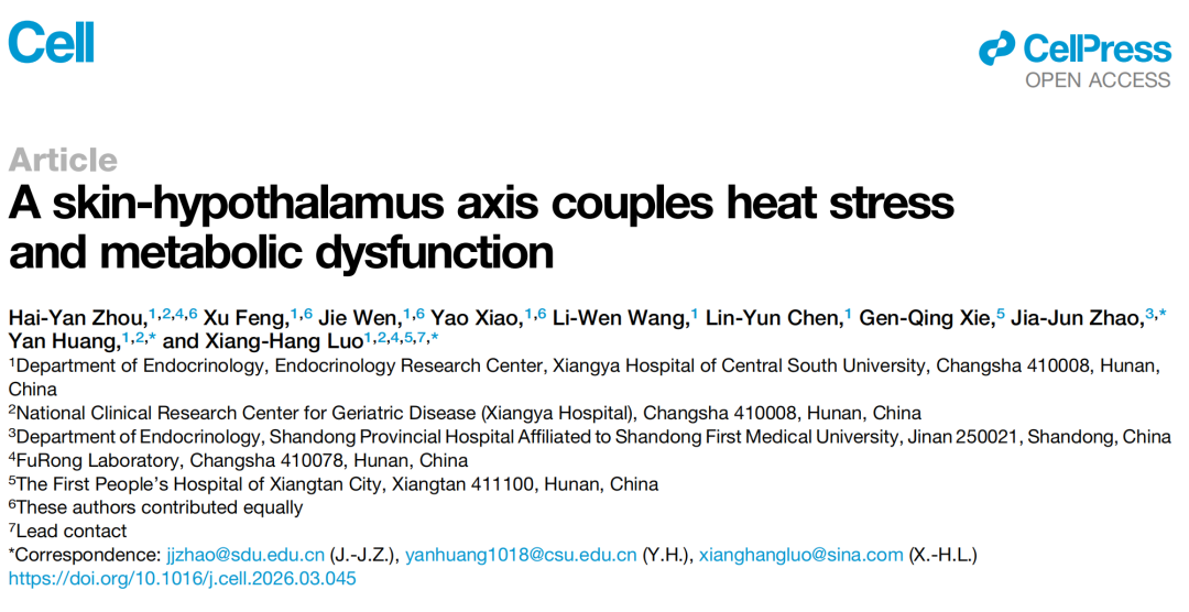 2026 年 4 月 21 日,中南大学湘雅医院罗湘杭教授、黄燕教授及山东第一医科大学附属省立医院赵家军教授作为共同通讯作者,在国际顶尖学术期刊 Cell 发表了题为:A skin-hypothalamus axis couples heat stress and metabolic dysfunction 的研究论文。