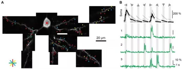 同时,给动物呈现简单的视觉刺激,例如水平和垂直条纹,使团队能够绘制出哪些突触对哪些方向作出响应。