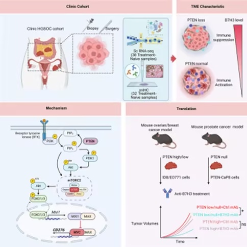 的研究论文。通过对初治卵巢癌临床样本进行单细胞RNA测序与多重免疫组化染色,本研究发现:PTEN下调可构建免疫抑制型肿瘤微环境,并伴随B7H3表达上调。