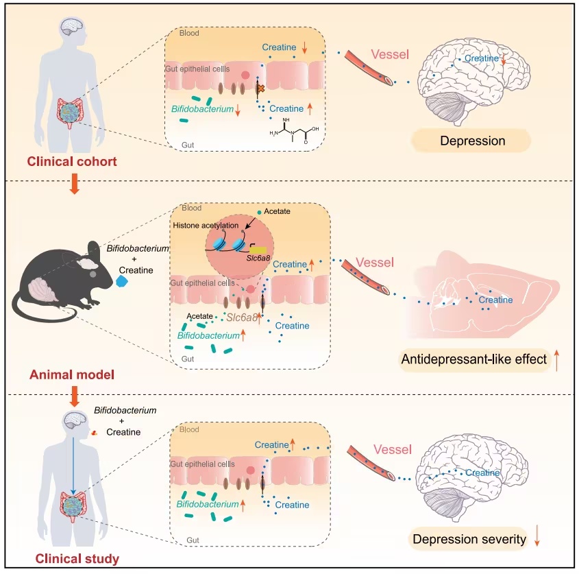 的研究论文。该研究首次系统揭示了肠道微生物可通过调节肌酸代谢,影响抑郁症的发生与发展,并创新性地提出了“双歧杆菌 + 肌酸” 的协同治疗新策略,为对抗抑郁症开辟了一条新路径。