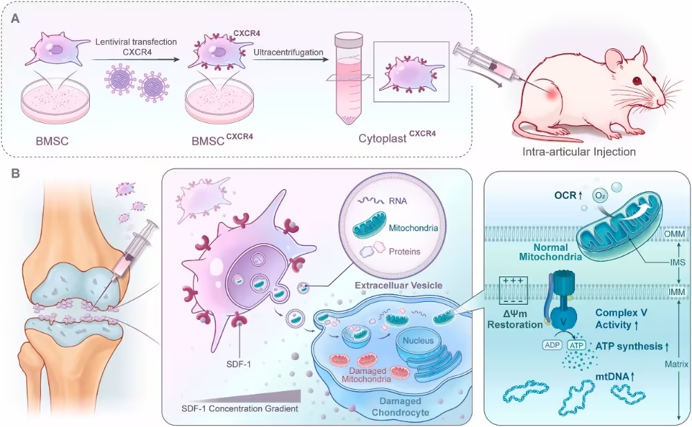 该研究假设,过表达趋化因子受体的去核细胞可主动归巢至软骨缺损部位,并通过直接线粒体转移与增强旁分泌信号恢复软骨细胞线粒体质量控制,进而促进软骨再生。作者通过基因工程技术使骨髓间充质干细胞过表达CXCR4,随后经超速离心制备得到去核细胞质体cytoplastsCXCR4。
