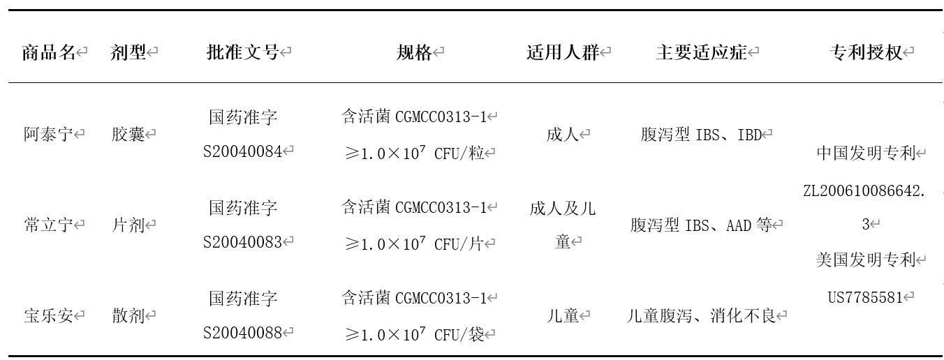表1 酪酸梭菌CGMCC0313-1主要上市制剂概况