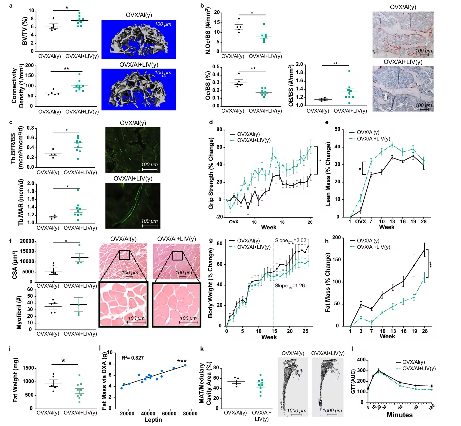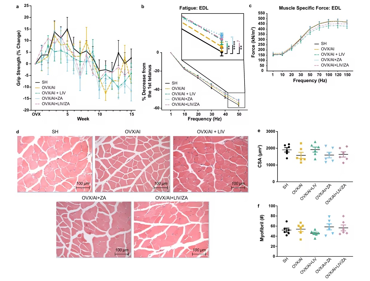 肌肉功能同样受益。离体肌肉收缩测试表明,联合组小鼠的伸趾长肌在反复刺激下更抗疲劳,表现接近正常对照组。骨髓脂肪方面,雌激素剥夺导致脂肪细胞数量明显增加,但联合治疗使这一增幅大幅回落,骨髓脂肪细胞数量和总面积分别下降62%和36%。