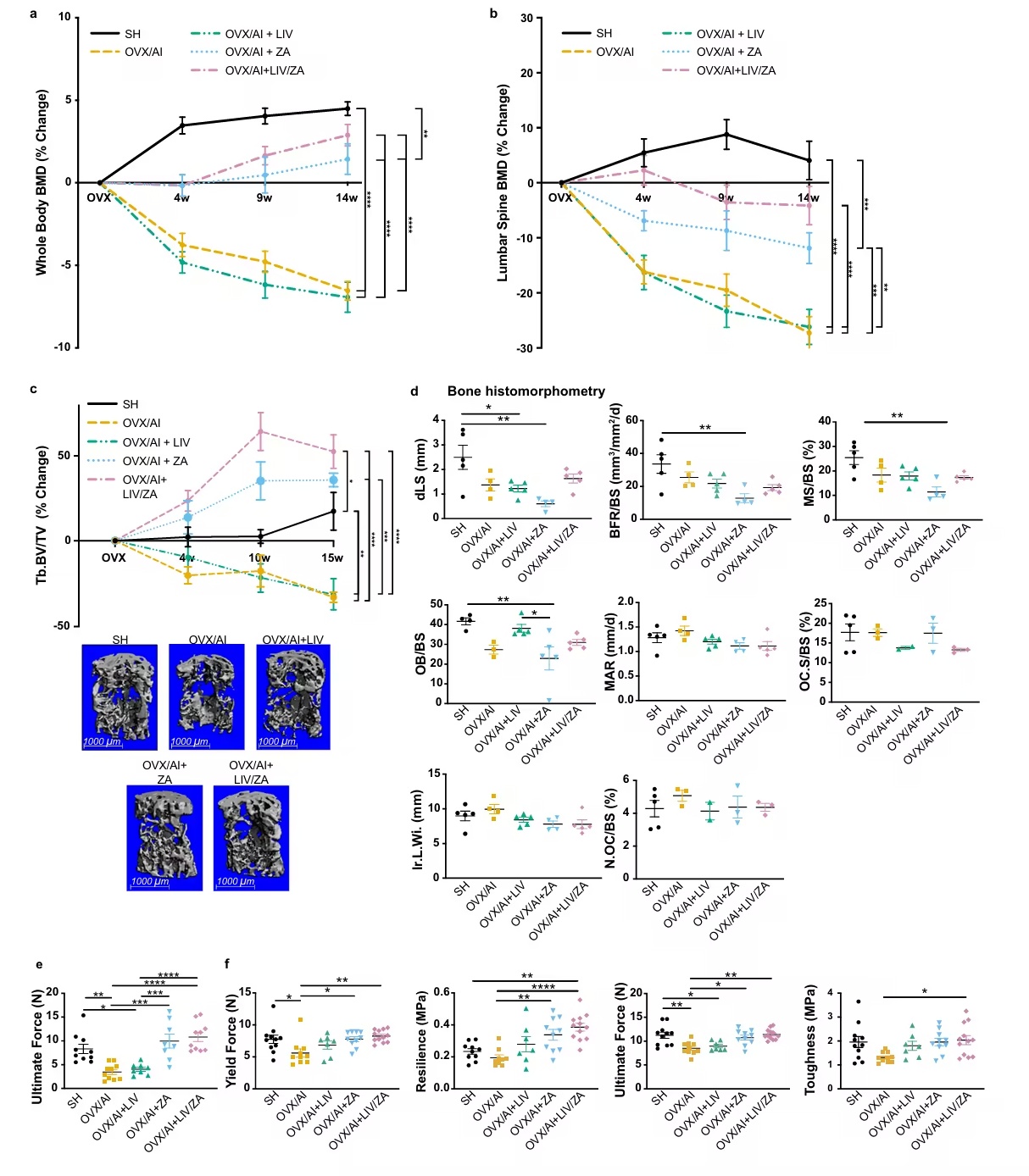 当研究对象换成骨骼已发育成熟的雌性小鼠时,情况有所不同。单纯使用振动已难以阻挡雌激素剥夺带来的骨量流失,单用唑来膦酸虽能提高骨密度,但仍低于正常水平。真正交出亮眼答卷的是联合治疗组:振动加唑来膦酸。
