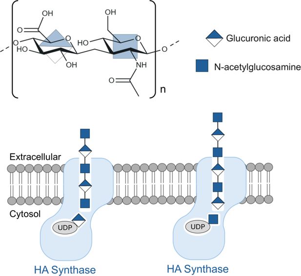 Hyaluronan biosynthesis is a multistep process that involves alternately binding one of two substrates, UDP-GlcA and UDP-GlcNAc, to the catalytic site of an enzyme called hyaluronan synthase, which is embedded in the plasma membrane of the cell (