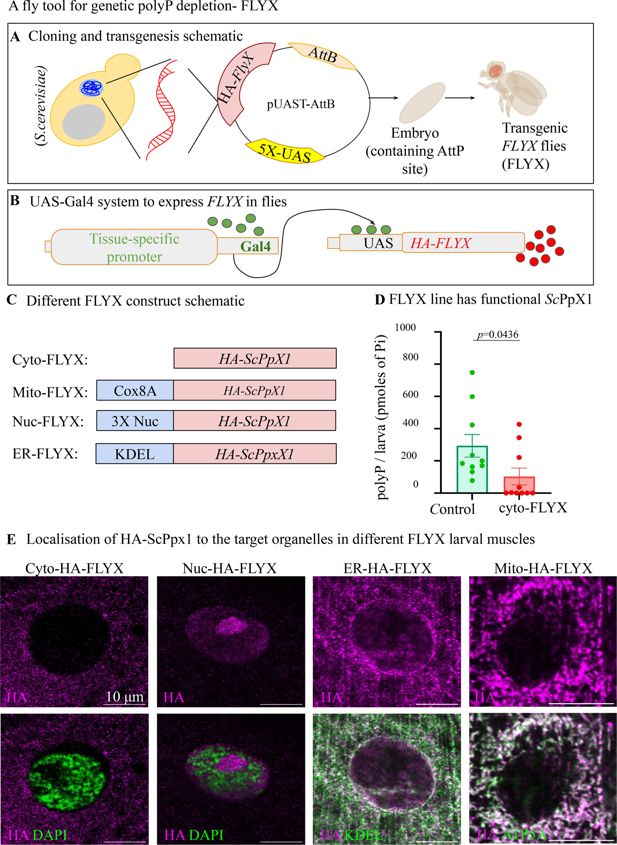 . We then engineered a FLYX system to deplete polyP in subcellular compartments in a tissue-specific manner. Using these tools, we demonstrated a spatiotemporal and subcellular compartment-specific regulation of polyP levels in various developmental stages and tissue types. We discovered that polyP is crucial for