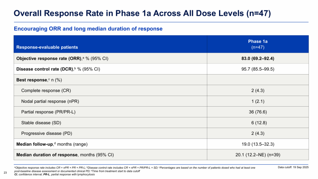 Ia期NX-5948-301研究结果显示,重度经治CLL/SLL患者接受Bexobrutideg(50-600mg)治疗后,客观缓解率(ORR)达到83%(39/47),其中2例患者实现完全缓解(CR),疾病控制率(DCR)为95.7%(45/47);中位PFS达到22.1个月,中位缓解持续时间(DOR)达到20.1个月。