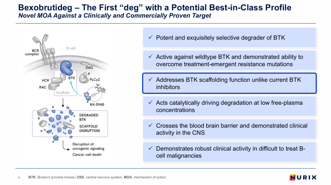 Bexobrutideg是Nurix Therapeutics自主研发的一款可口服且可透脑的高选择性BTK降解剂。该药物是继