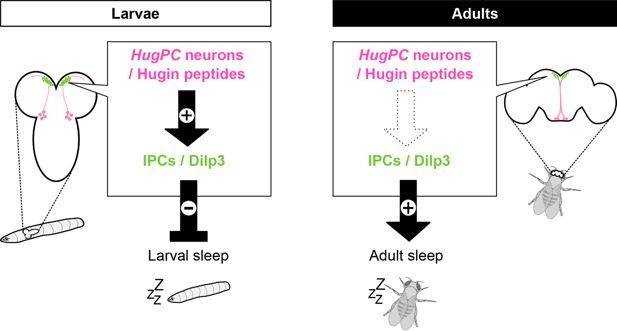 larvae. Through an unbiased screen, we identified the neuropeptide Hugin and its receptor PK2-R1 as critical regulators of larval sleep. Our genetic and behavioral data suggest that HugPC neurons secrete Hugin peptides to activate insulin-producing cells (IPCs), which express a Hugin receptor PK2-R1. IPCs, in turn, release insulin-like peptides (Dilps) to regulate sleep. We further show that the Hugin/PK2-R1 axis is dispensable for adult sleep. Our findings thus reveal the neuromodulatory circuit that regulates developmental sleep in larvae and highlight differential impacts of the same modulatory axis on early-life sleep and adult sleep.