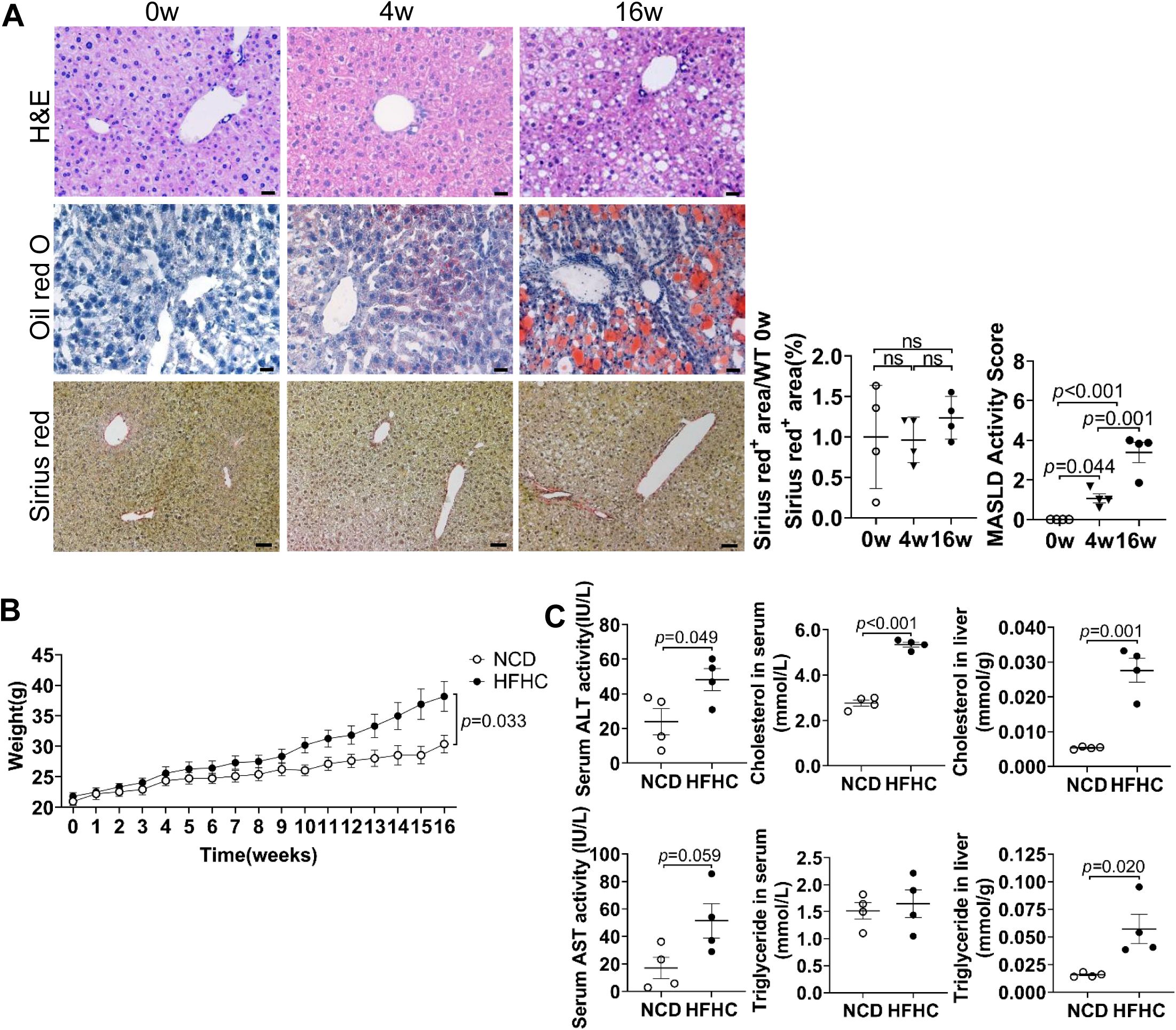 ). By 16 weeks of HFHC feeding, both lipid droplets and immune cell infiltration had increased significantly, though liver fibrosis --- as indicated by Sirius red staining, which labels collagen deposition --- was still not induced, and MASLD activity score remained below 4 (