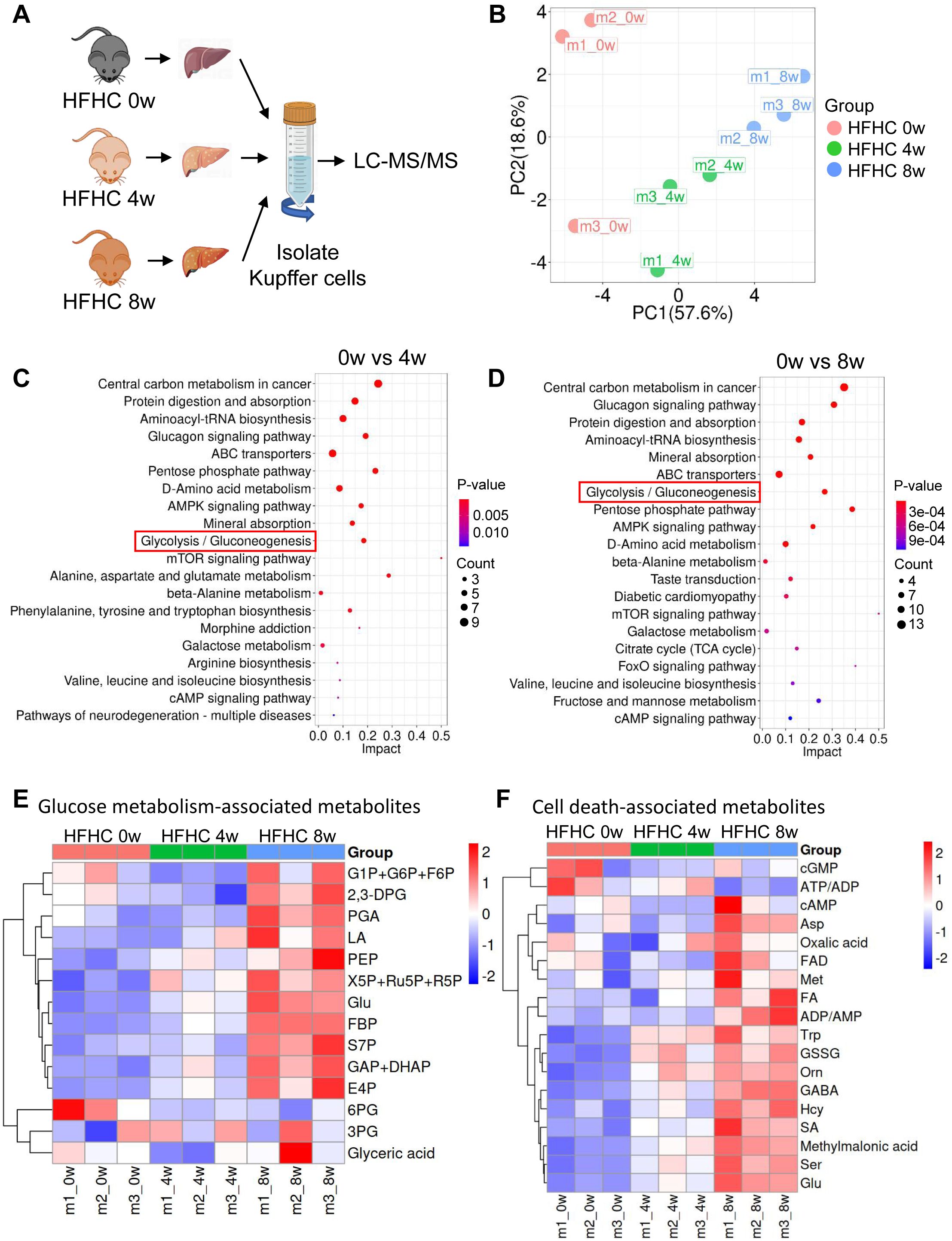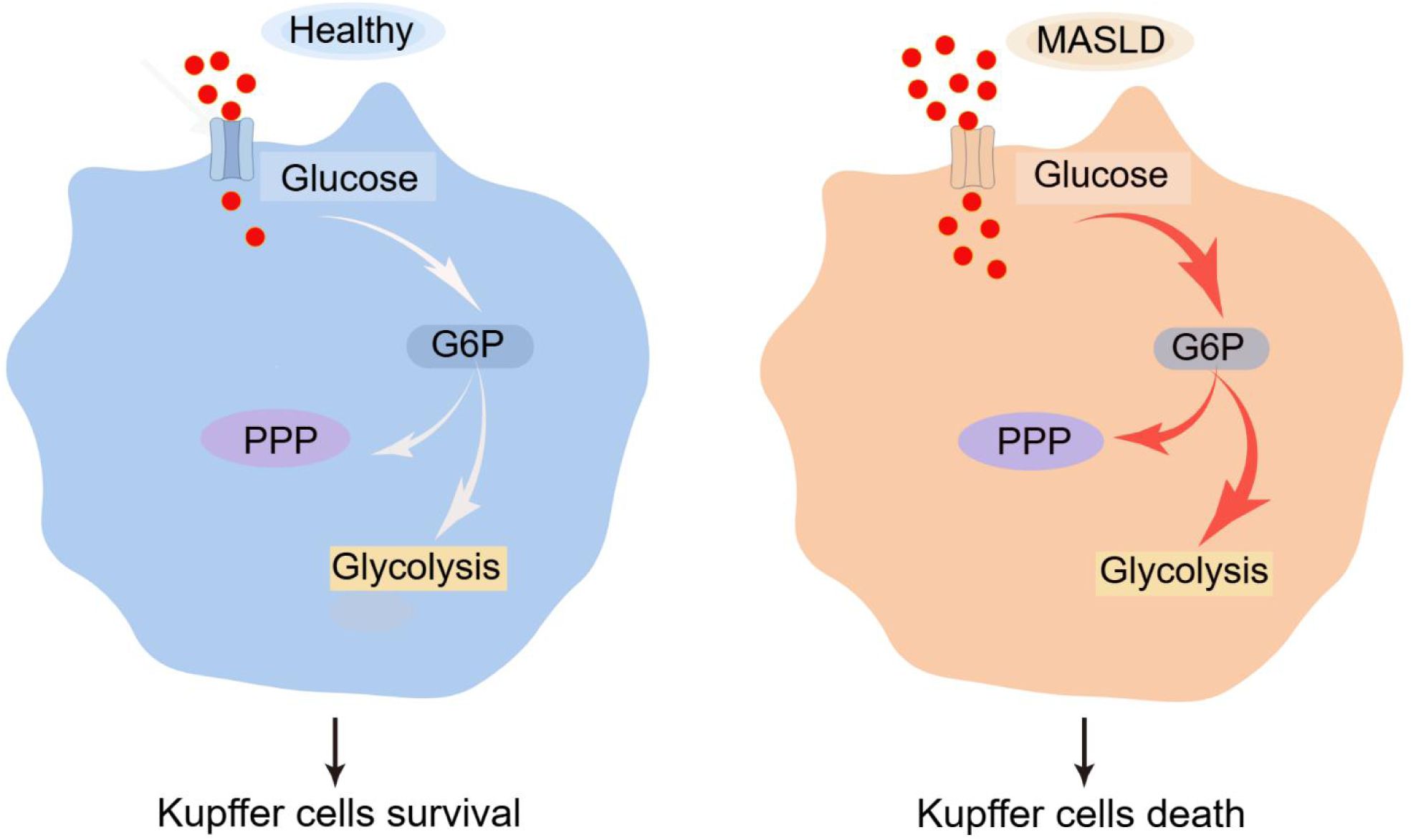 . Within the unique metabolic milieu of the MASLD liver, characterized by lipotoxicity, insulin resistance, and disrupted nutrient fluxes, it is plausible that KCs metabolism is profoundly altered. However, whether these metabolic perturbations directly contribute to the observed loss of KCs, and through which specific metabolic pathways, remains unclear. Therefore, this study aims to investigate the role of glucose metabolism in governing KCs susceptibility to death during MASLD progression. We sought to define the glucose metabolic alterations that occur in KCs as MASLD develops and to establish a causal link between metabolic reprogramming and KCs loss. Elucidating these mechanisms is essential for advancing our understanding of MASLD pathogenesis and for identifying potential therapeutic targets to preserve KCs homeostasis and mitigate disease progression.