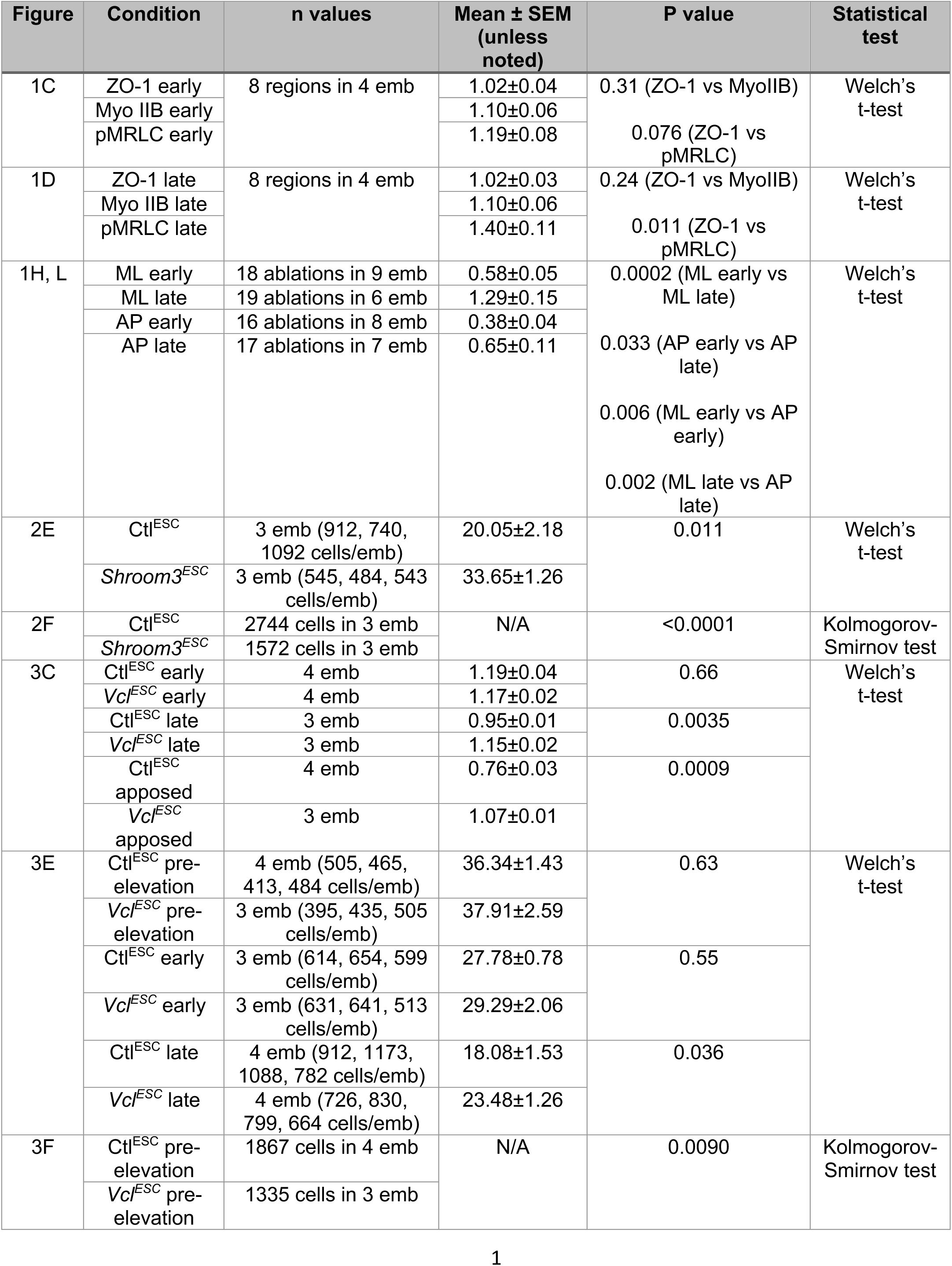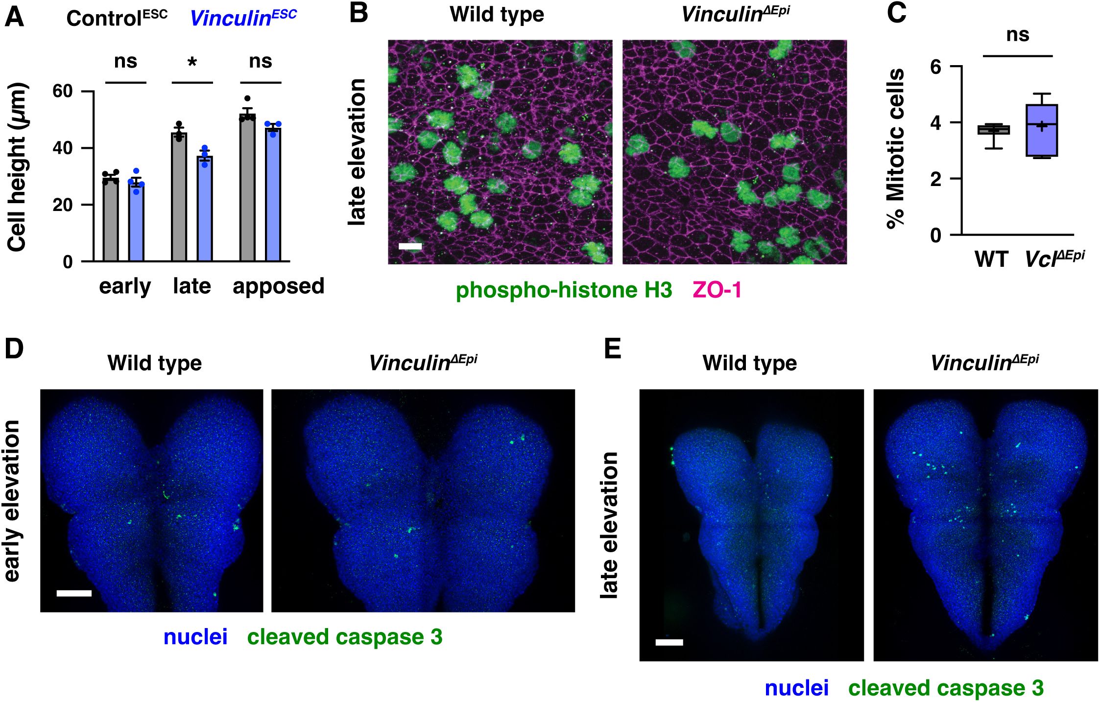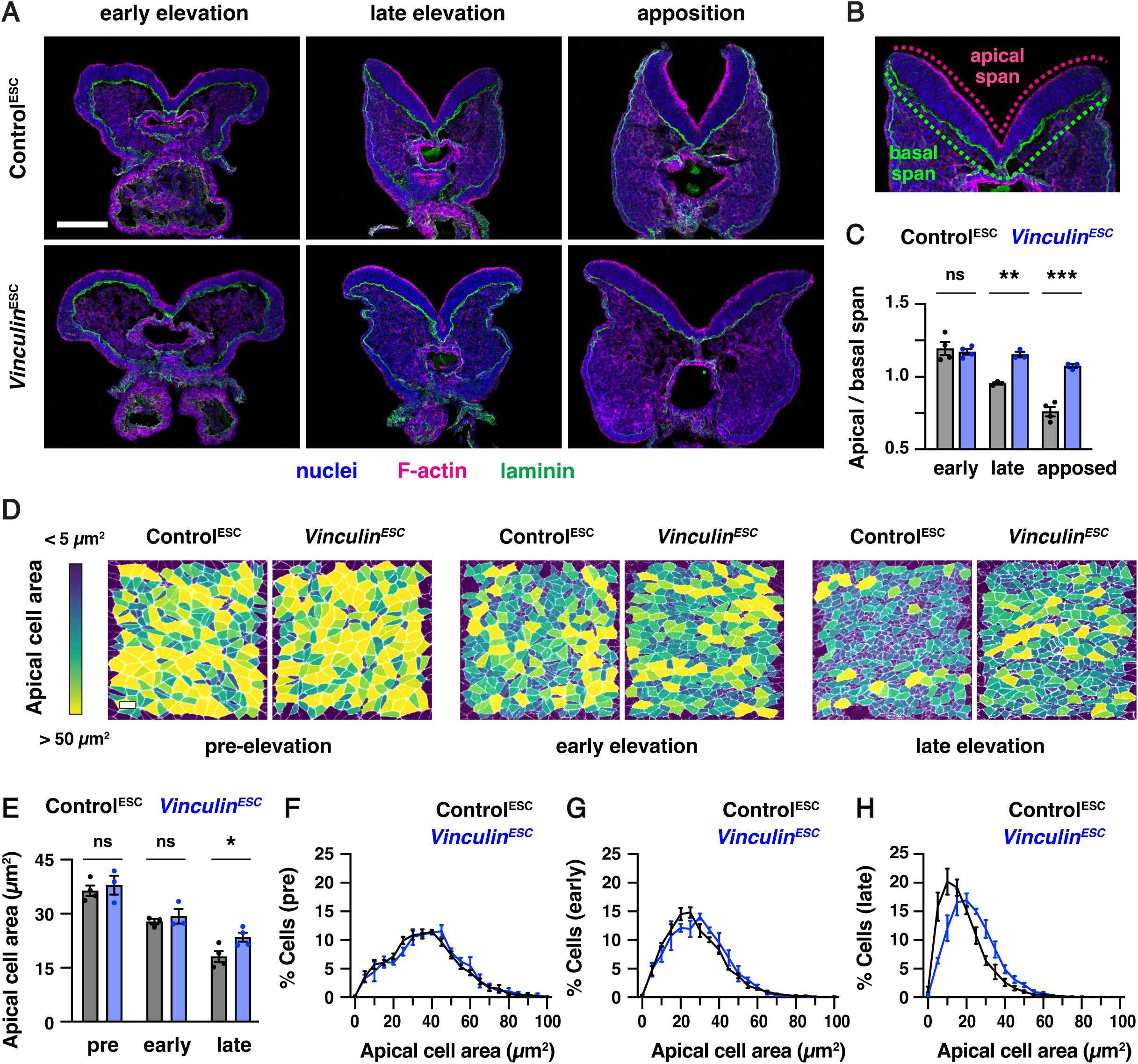 mutants were most pronounced at adherens junctions, whereas tight junctions remained largely intact, and resulted in a progressive disruption of cell adhesion, cell division, and apical constriction behaviors during cranial neural tube closure. These results demonstrate that Vinculin is necessary to stabilize cell adhesion in the presence of endogenous forces in the mouse cranial neural plate and suggest that this function is necessary to convert mechanical forces into changes in cranial neural tube structure.