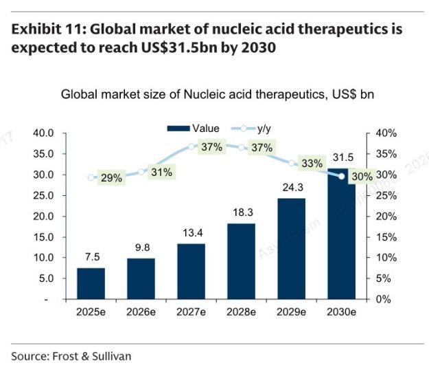 市场规模高速增长:据弗若斯特沙利文数据,2025年全球核酸疗法市场规模约75亿美元,预计2025-2030年复合年增长率超30%,2030年市场规模将达315亿美元。