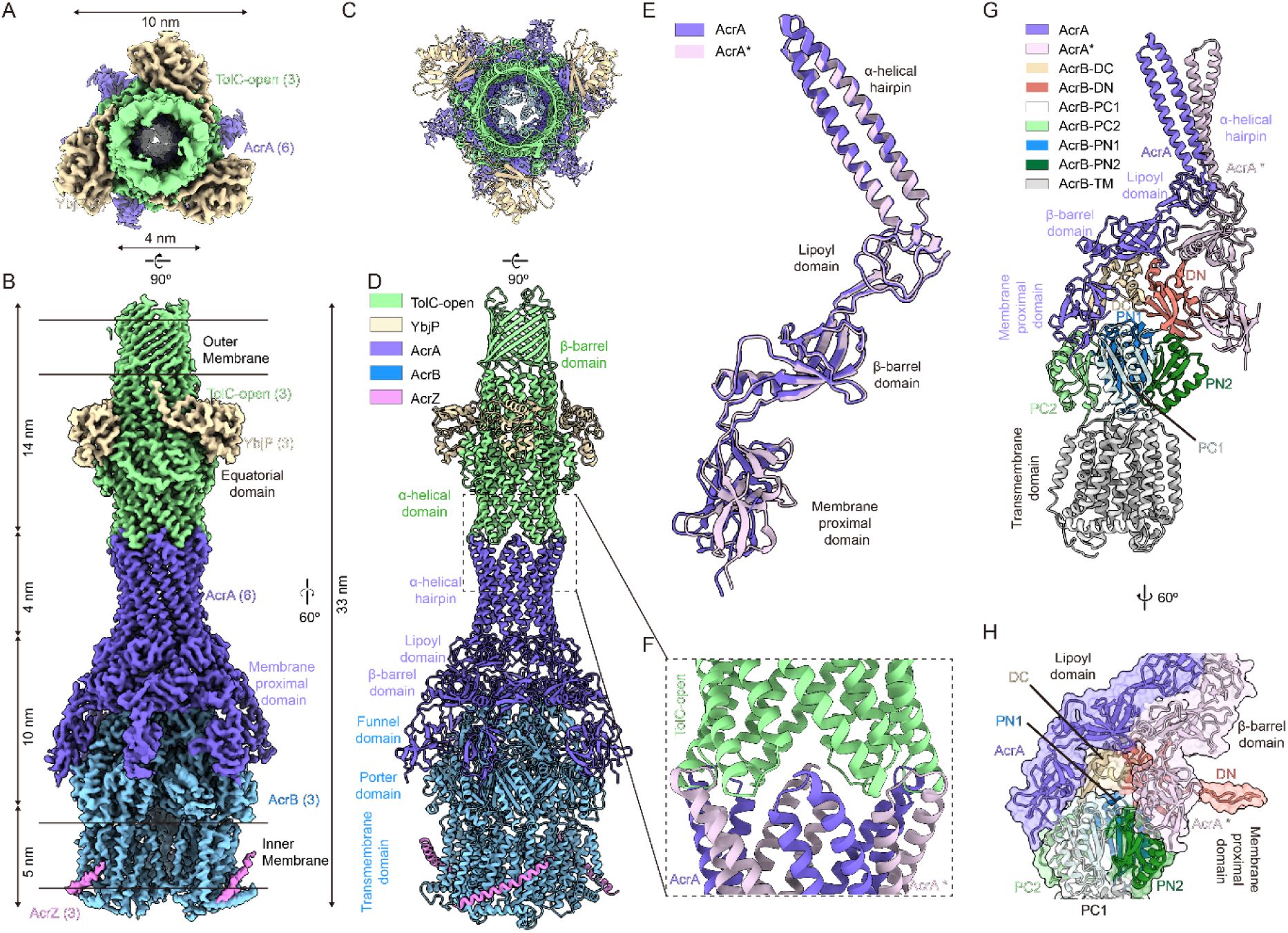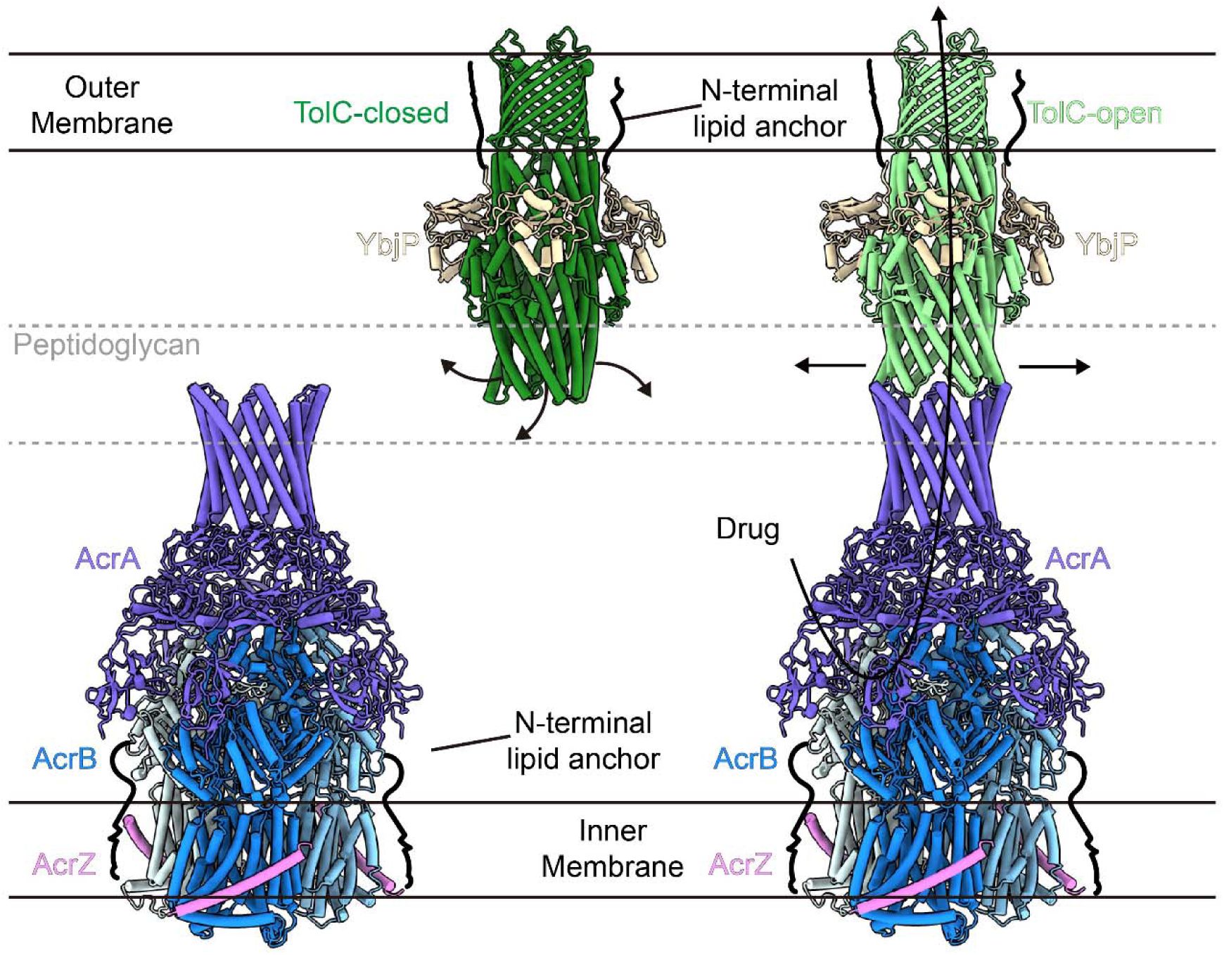 . The first is a 3.56 Å structure of a TolC–YbjP subcomplex, and the second is a 3.39 Å structure of the fully assembled TolC–YbjP–AcrABZ pump. These structures reveal a previously uncharacterized outer membrane lipoprotein, YbjP, bound to TolC, and shed light on how TolC is secured and transitions to the open state. Together, these findings enhance our understanding of the architecture, assembly, and regulation of this clinically important efflux pump.