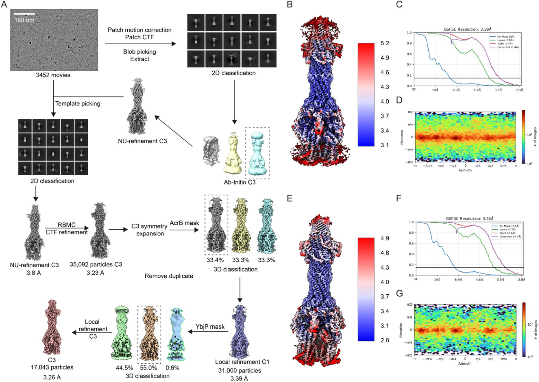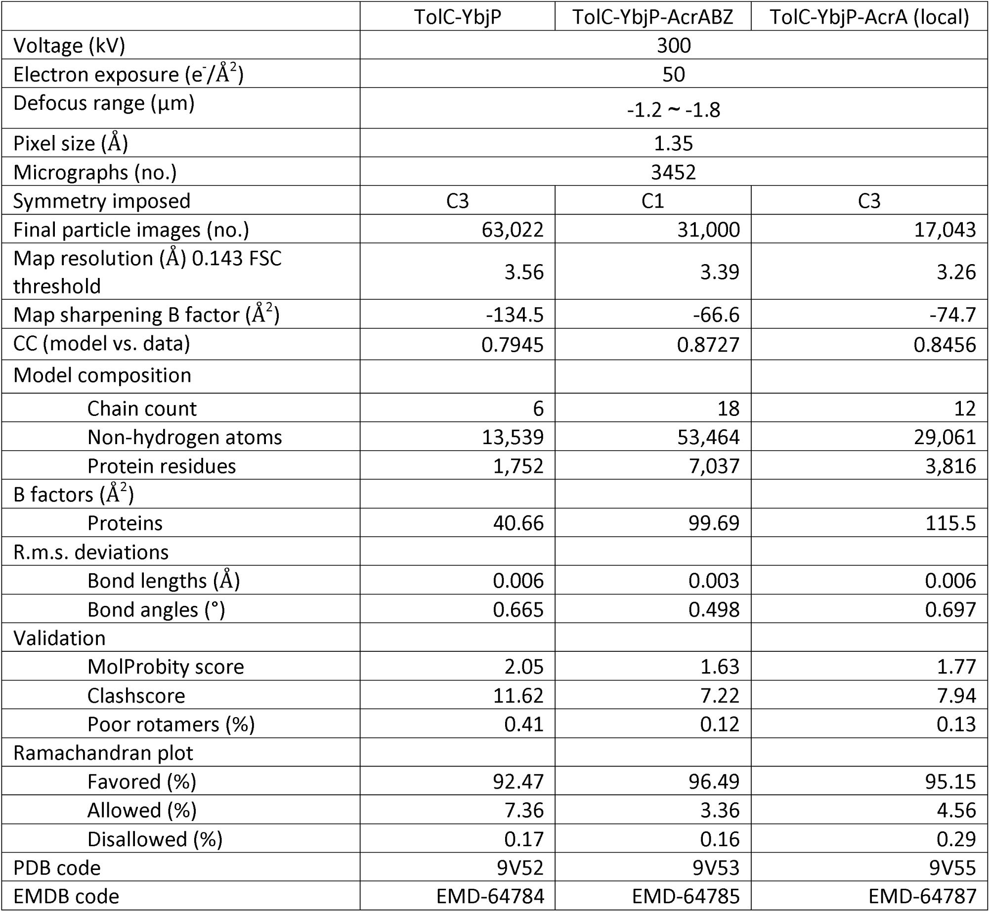 : a TolC–YbjP subcomplex at 3.56 Å resolution and the complete TolC–YbjP–AcrABZ pump at 3.39 Å. Structural analysis reveals that YbjP, a previously uncharacterized lipoprotein, binds TolC in a 3:3 stoichiometry, bridging the TolC protomers at their equatorial domain. Clear density of the mature YbjP’s N-terminal Cys19 indicates that YbjP is anchored to the outer membrane by an N-terminal lipid moiety. Notably, YbjP remains bound as TolC undergoes AcrA-induced opening, suggesting that this accessory protein accommodates the conformational change. The AcrB trimer simultaneously presents three distinct conformational states (L, T, O), capturing a complete transport cycle. These high-resolution structures provide insights into the architecture and mechanism of clinically relevant efflux machinery, identifying YbjP as a previously unrecognized structural component that contributes to TolC positioning and may assist in its membrane localization.