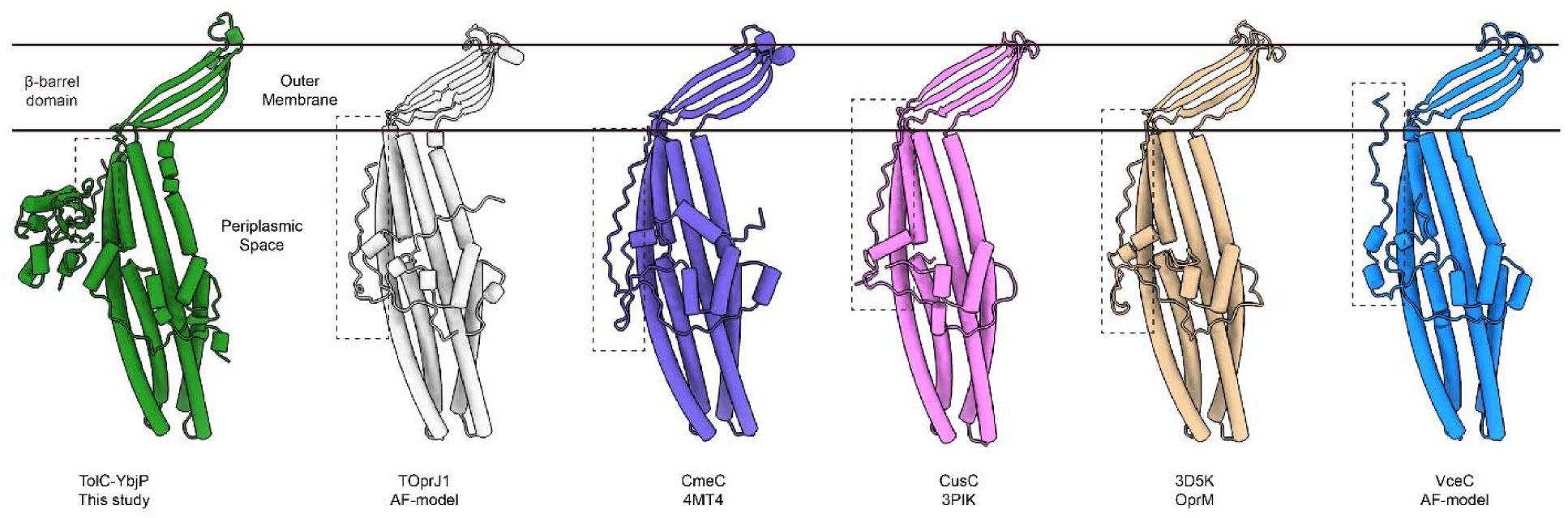 ). The identification of YbjP, along with its defined membrane anchoring and structural compatibility with TolC, suggests a new class of outer membrane partners that may regulate the TolC-dependent pathways. Notably, the structure of TolC shows no conformational changes upon YbjP binding when compared to the free, closed form of TolC
