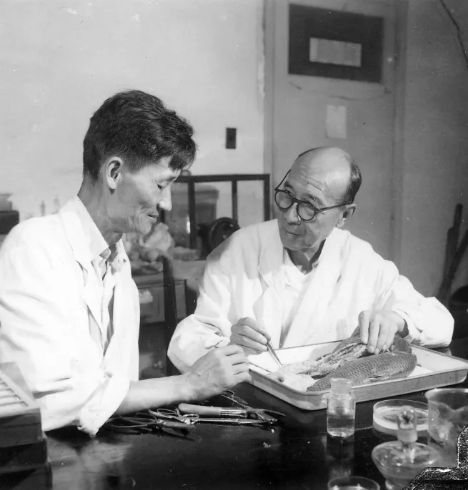 ▲秉志(右)指导同事开展鲤鱼实验形态学研究