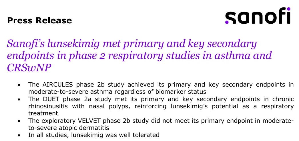 4月7日,赛诺菲宣布TSLP/IL-13双抗lunsekimig在两种慢性呼吸系统疾病中进行的II期研究均达到了主要终点和关键次要终点。在两项研究中,lunsekimig耐受性良好,安全性特征可接受。