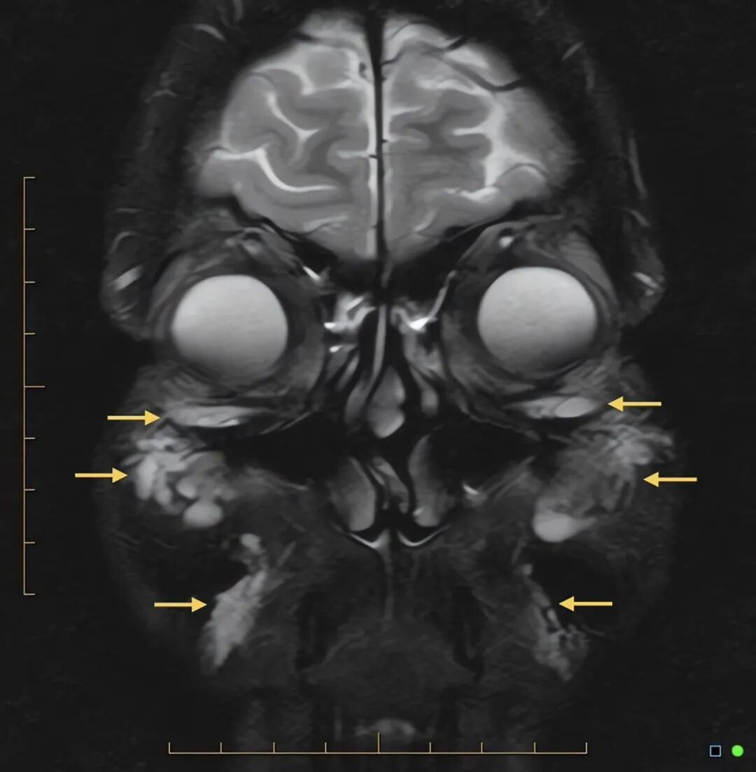 图4. 冠状位 T2 加权磁共振成像(MRI),示眶下区、颧前区、面颊深部及木偶纹区可见多发 T2 高信号灶(箭头所示);上述信号符合残留透明质酸填充剂的影像学特征,但可与水肿或其他软组织积液的信号相重叠。