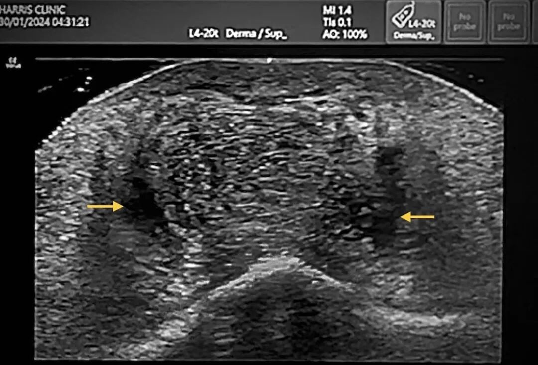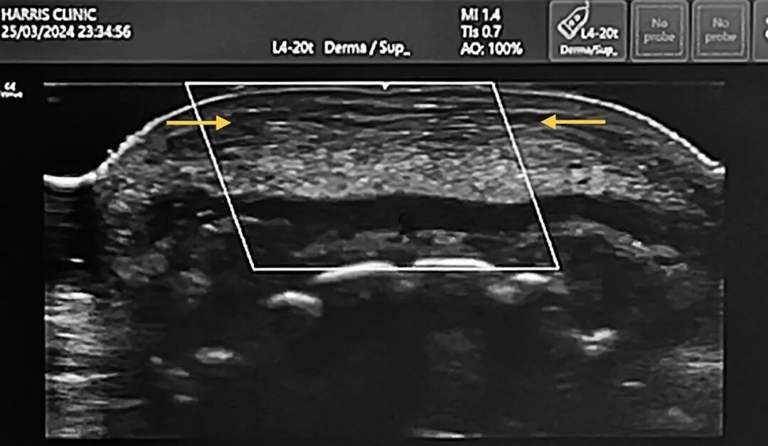 图5. 颏部超声图像,示陈旧性填充剂相关继发改变,包括持续存在的透明质酸填充剂(箭头所示)、间质水肿,以及高回声纤维性间隔。