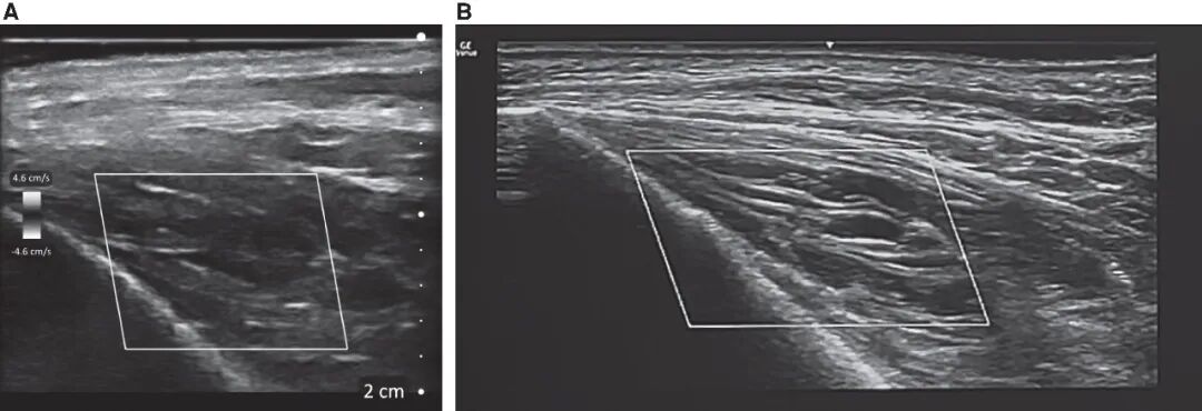 图3. 两种超声设备的成像效果对比。(A)手持式超声设备 Clarius L20;(B)高分辨率医用超声系统 GE Venue Go,搭配 L420 探头;图像清晰展示了二者在轴向分辨率与侧向分辨率上的差异。