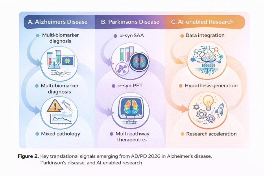 摘要 第20届阿尔茨海默病和帕金森病及相关神经系统疾病国际会议(AD/PD 2026)于2026年3月17日至21日在丹麦哥本哈根召开。大会官方资料显示,本届会议继续以神经退行性疾病的早期诊断、疾病机制、转化研究、药物开发和临床试验为主轴,并特别强调阿尔茨海默病(AD)、帕金森病(PD)及相关神经系统疾病之间的交叉与一致性结果。综合大会官方定位与会后专业综述可以看出,虽然本届会议未发布单独的统一“官方共识声明”,但在研究范式层面已经形成较清晰的方向性共识:神经退行性疾病研究正在由单病种、单靶点、单指标的线性模式,转向跨疾病整合、基于生物标志物的精准分层,以及以真实临床结局为导向的综合评价框架。大会代表性成果主要体现在三方面:其一,AD领域多标志物联合诊断与病程预测能力进一步提高;其二,PD领域α-synuclein相关检测与成像技术持续推进,推动疾病生物学分层;其三,人工智能与数字平台开始从辅助分析工具转向科研协同基础设施。与此同时,大会也暴露出当前研究的现实局限,即标志物进展快于临床获益证据积累,精准分层快于精准治疗成熟,病理信号向功能、行为及照护结局的转化仍有明显缺口。本文基于大会官方资料及权威会后报道,对AD/PD 2026的主要共识、重点成果、未来趋势与现实局限进行系统综述,以期为神经退行性疾病研究与临床转化提供参考。